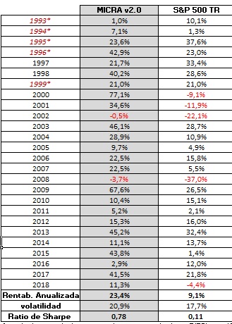 Contestando a tu pregunta, a continuación incluyo una tabla con las rentabilidades anuales obtenidas aplicando el sistema en comparación con el S&P 500 total return (con dividendos). Destacan sobre todo los periodos 2000-2002 y el año 2008, en los cuales los mercados sufrieron fuertes correcciones, mientras que el sistema apenas las notó, e inclusó llego a terminar en positivo en 2000 y 2001 con un amplio margen respecto a los índices.