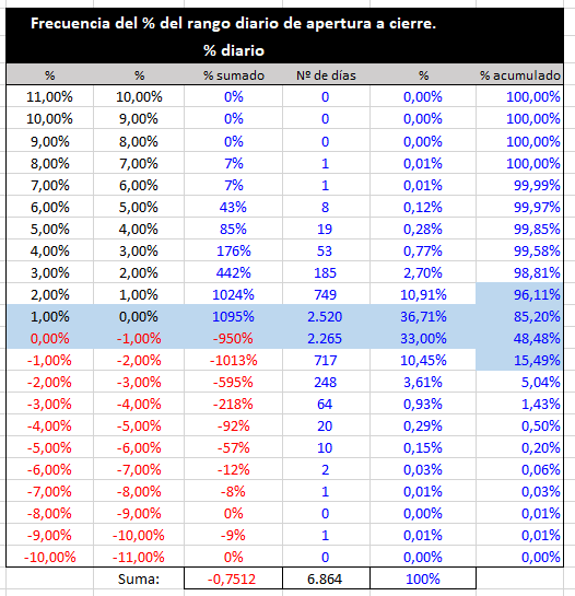 ¿Te refieres a alguna de las tablas que subo? Son del índice IBEX35 desde el año 1993. Quizá fuera mejor hacerlas algorítmicas para quitar la tendencia.landorra escribió: 02 Nov 2020 22:03 No fastidies que había estado mirando todo el tiempo unos valores de ATR sin saberlo. :O Obviamente que no se puede saber si subirá ao bajará. La variación es solo el rango de precio, no su dirección. ¿Se puede obtener entonces un valor porcentual a partir del ATR?