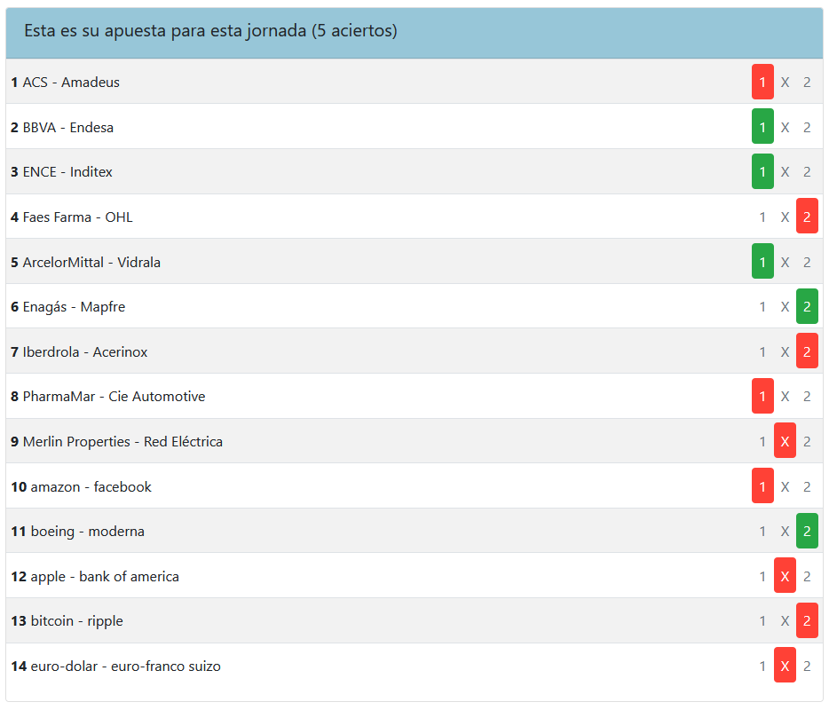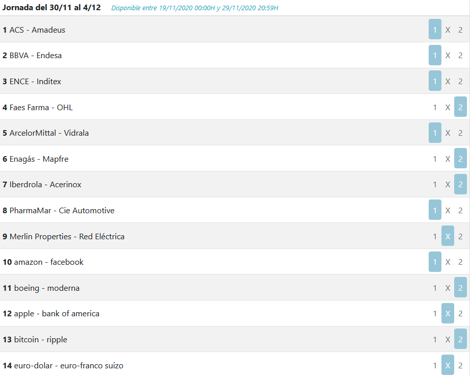 El jugador deberá marcar 1-X-2 dependiendo de quien crea que va a subir más, que su rival, en Bolsa (también hay divisas y criptodivisas) durante esa semana completa (de lunes a viernes). La idea del juego es la siguiente: supongamos que tenemos dos activos, A y B.