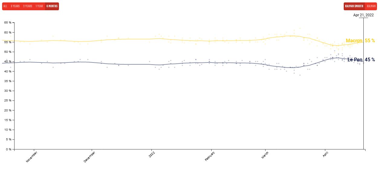 Las cosas están bastante ajustadas (55% Macron - 45% Le Pen) tal y como podéis ver en este gráfico: