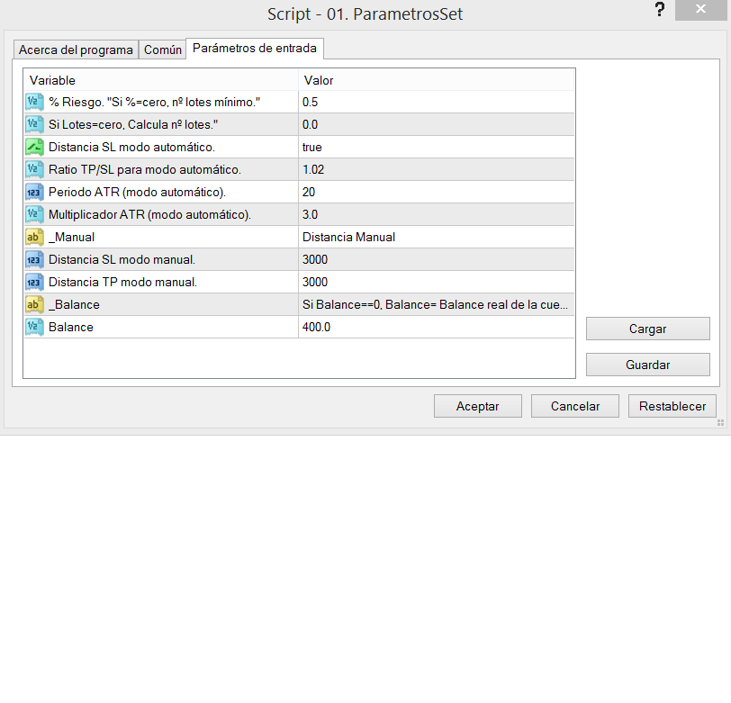 Lo primero que tengo es un scrip llamado "ParametrosSet" que una vez ejecutado te muestras la distancia al SL y TP, el riesgo asumido y el numero de lotes. Pero eso no se queda ahí. Esos datos son los que usan los scrips de órdenes para cuando los ejecutas para que no tengas que entretenerte en hacer calculos ni nada.