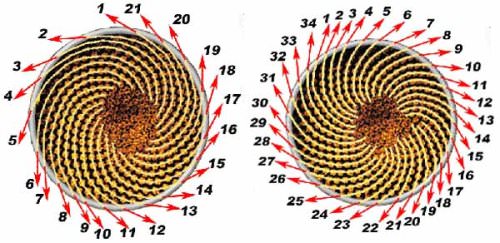 El número phi, además de en la bolsa, se encuentra en muchas otros sitios de la naturaleza. Por ejemplo, en los girasoles. Os recomiendo que os molestéis alguna vez en contar las espirales que se forman. Si lo hacéis en un sentido os saldrá un número de la serie de Fibonacci y si lo hacéis en el contrario os saldrá el siguiente o el anterior. A continuación os pongo una imagen en la que se ve esto y en la que las espirales están contadas: