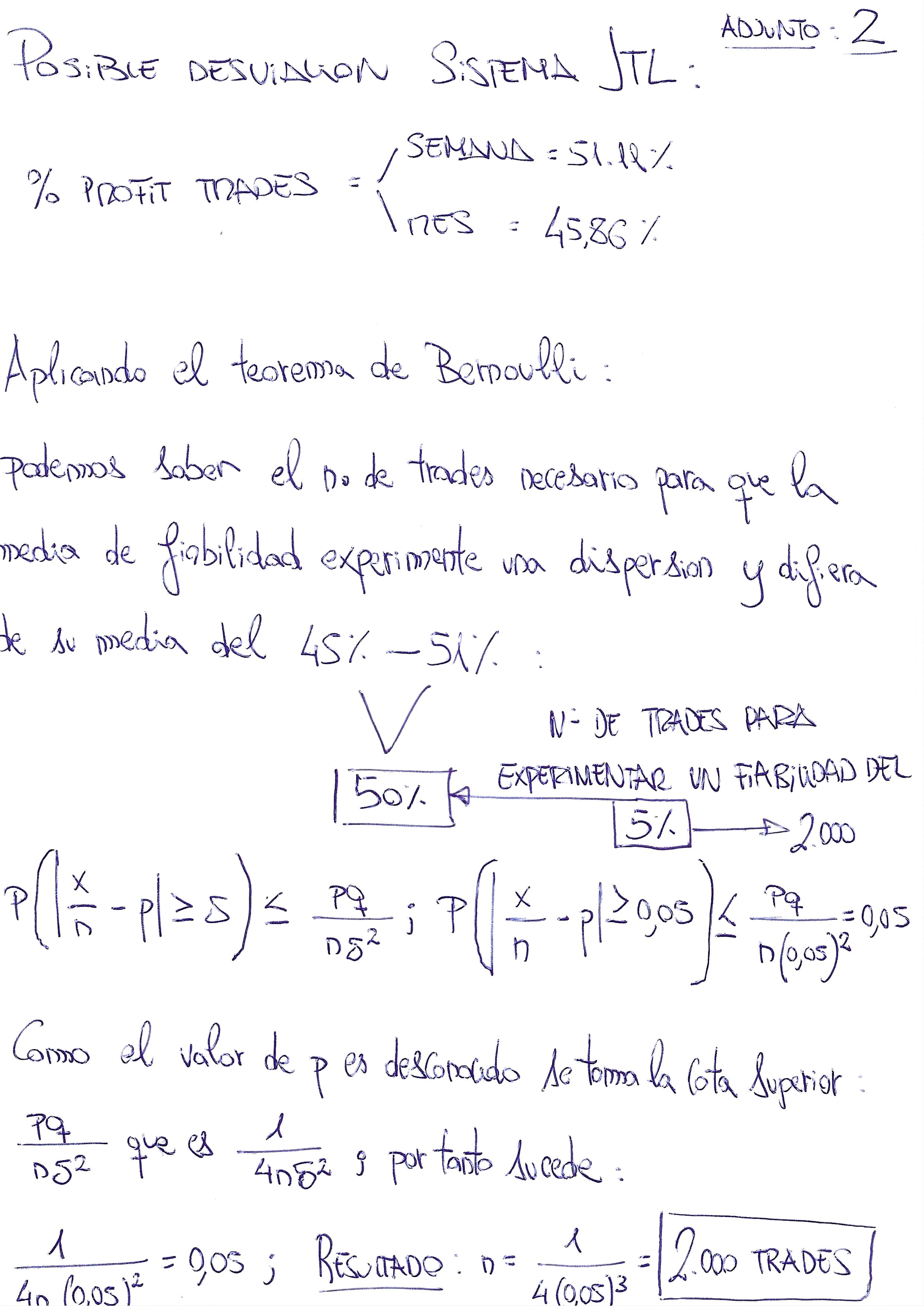 Para saber cada ucantos trades puede descendenr la fiablidad al 5% por ejemplo podriamos aplicar la ecuacion del adjunto 2 y llegar a una aproxiamcion de 2000 trades............