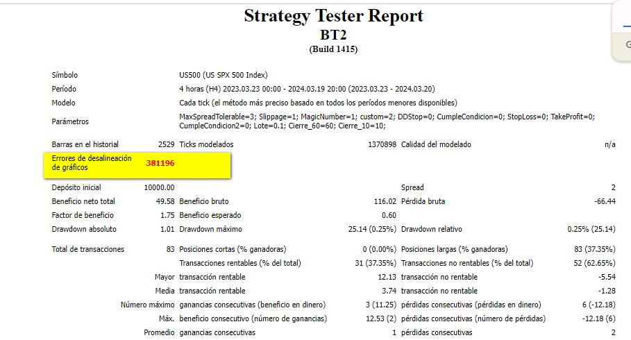 La verdad es que es la primera vez que oigo ese error. ¿Puedes cambiar el idioma a la plataforma y sacar el error en inglés, a ver qué encuentro? En todo caso, suena a que algo no está bien en la relación entre Open, High, Low y Close.Santyuste escribió: 28 Abr 2024 20:07 Hola. He exportado con Quant Data Manager los dastos del SP500 a csv, lo he convertido a UTC1 y luego los he importado en MT4. Al hacer el backteting desde MT4 pone "Errores de desalineación de gráficos" ¿Esto que quiere decir y a que es debido?
