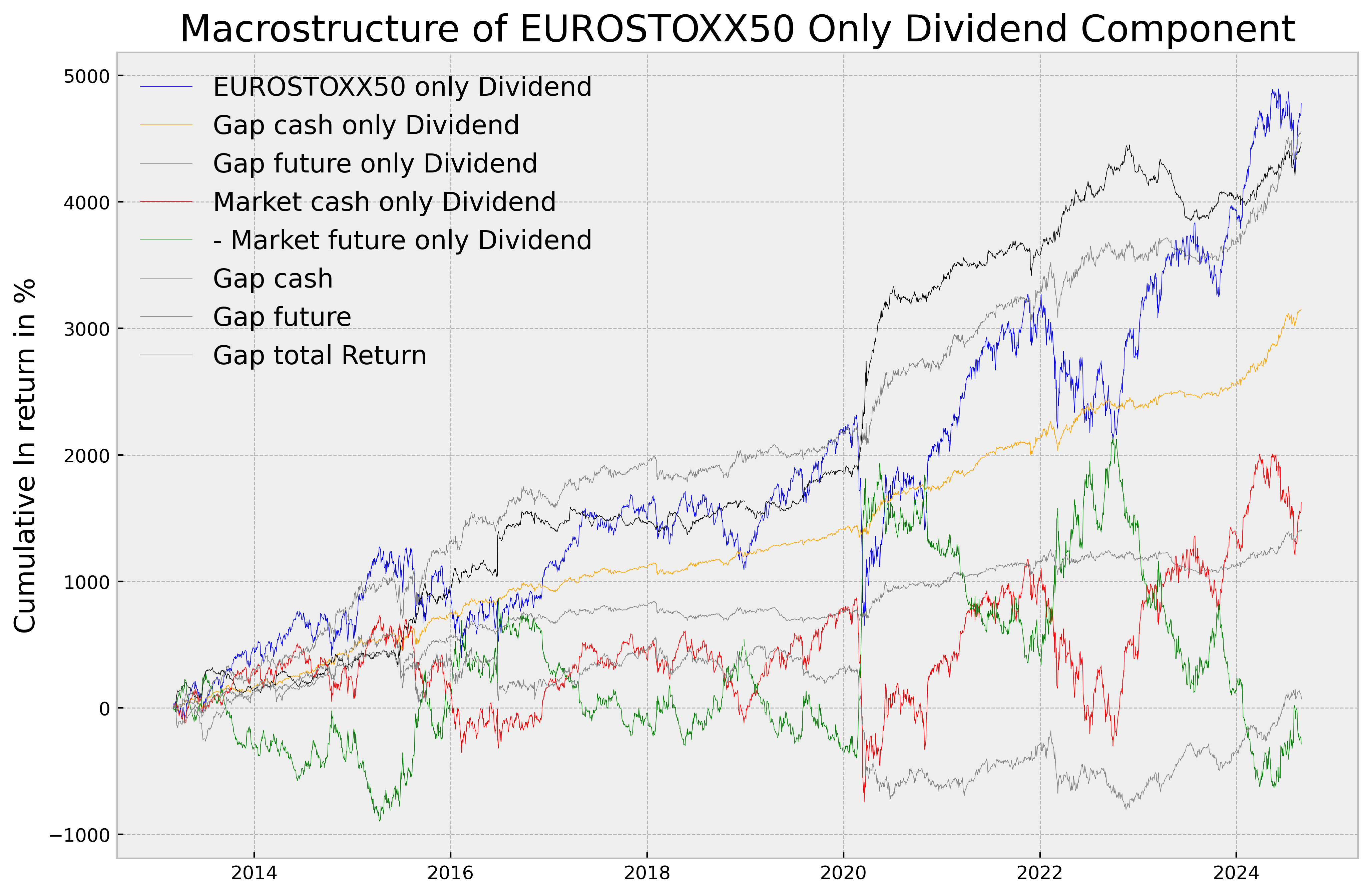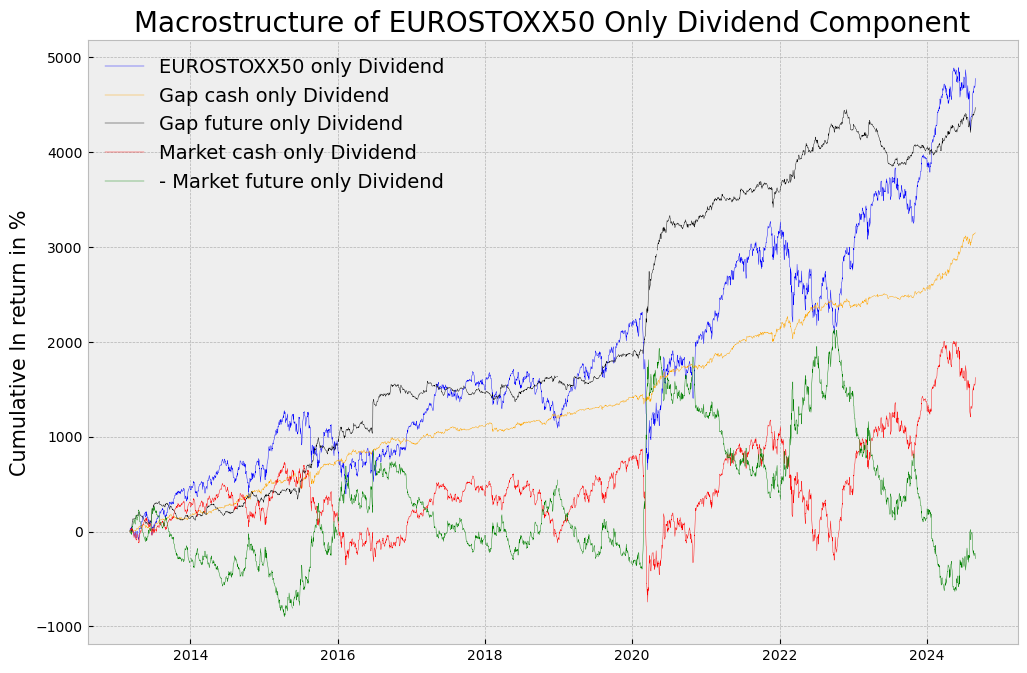 Y bautizo a este nuevo índice, como el EUROSTOXX50 Only Dividend. Y como para el caso del CAC40 o Eurotoxx50, comprobamos como las macroestructuras individuales del spot, futuro, y Total Return, apenas nos brindan información de máximos y mínimos de mercado (Se me olvido meter ciertos componentes, así que mejoramos el post de hace unas horas)