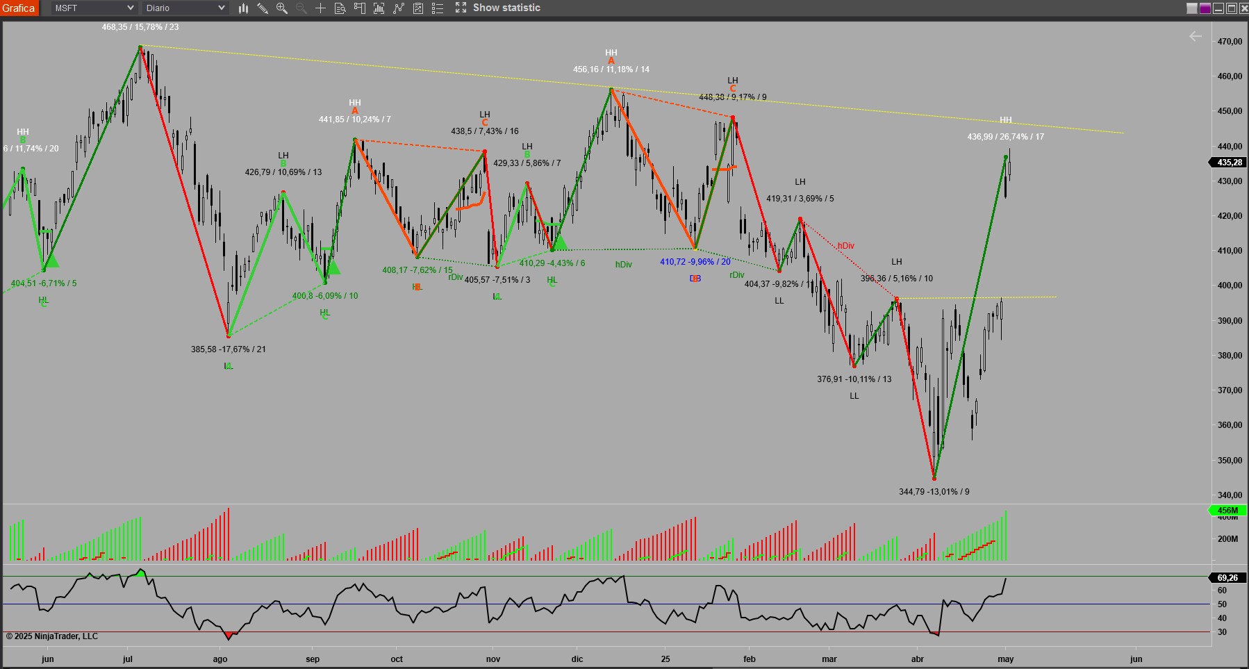 MSFT es actualmente quien mayor capitalización tiene en el SP y presentó recientemente unos buenos resultados, pero se dejó un hueco y por delante y tiene su directriz bajista que debe superar.