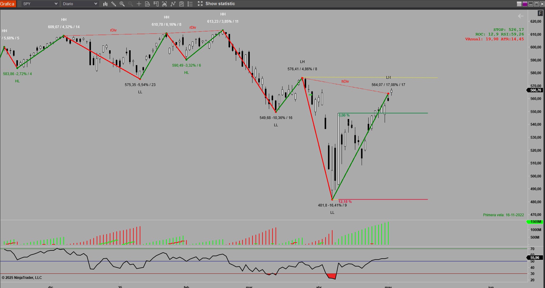 El problema viene ahora con el SPY. Tiene que perforar el 576 con contundencia para hablar del fin de la corrección. Y parece que tiene una divergencia oculta en el RSI.