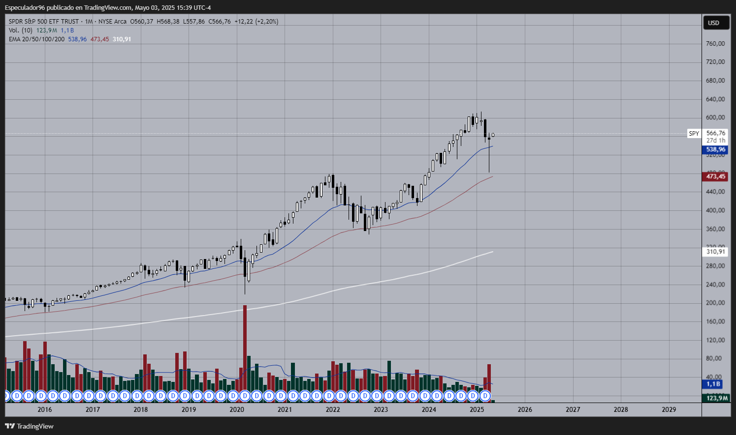 Me parece excelente tu análisis, en especial la correlación que ves entre Tesla y el S&P500. El SPY es una buena manera de poder apreciar el interés de los inversores mediante el volumen. Agregaré que el SPY en mensual acompañó a un patón de reversión bastante vistoso, con un gran volumen, lo que pudiese indicar que en este mes veamos una continuación del movimiento alcista. También quisiera agregar que en gráfico diario en Tesla tenemos un doble suelo con una compresión en el límite del rango. Generalmente esto augura fuerza y volatilidad. En mensual Tesla muestra un patrón de reversión notorio también. Lo que hace que desde diferentes temporalidades halla una clara alineación de lecturas. Esto generalmente atrae a inversores. En conclusión, que aunque estemos en un contexto de inestabilidad, y los mercados siempre sean peligrosos, no me parece una entrada tan alocada, siempre y cuando uno asuma su responsabilidad y siga una correcta gestión de riesgo. Habrá que esperar a ver cómo se desenvuelven las cosas en estos días.Gibranes escribió: 03 May 2025 21:02 Hola, especulador: