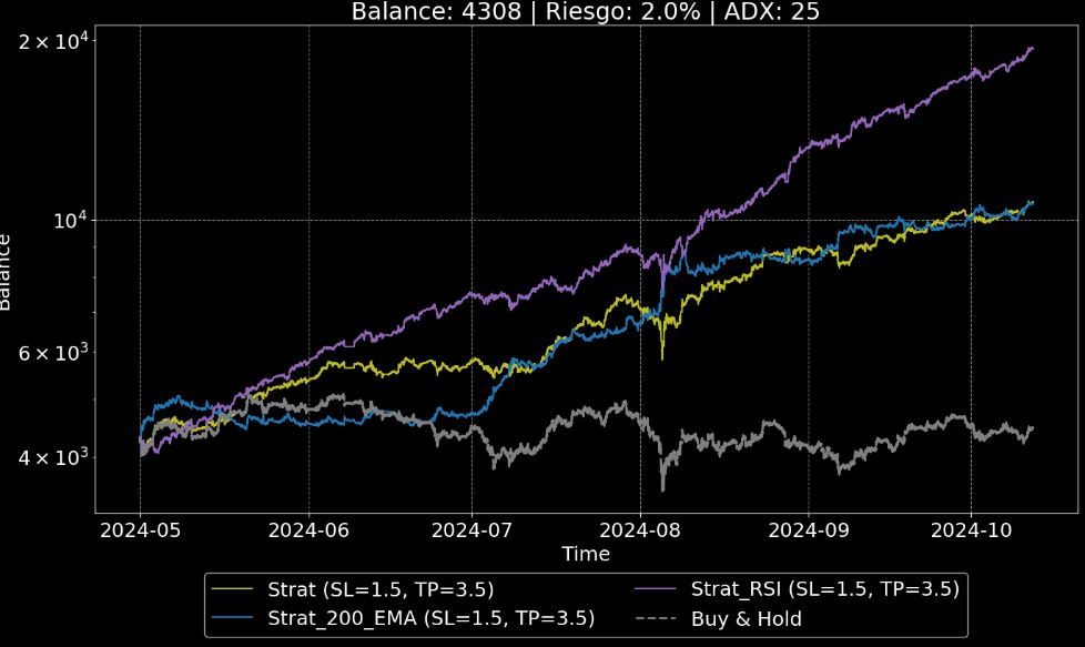 Estoy probando un código en python en Jupiter notebooks que usa Pandas le estoy metiendo datos de BTC y los resultados eran muy buenos, lo he estado evolucionando, ahora funciona en long y short, tiene trading fees (super importante!, muchas pruebas dejan de ser rentables con las fees), apalancamiento…, saca logs para diagnosticar y algunas cosas más