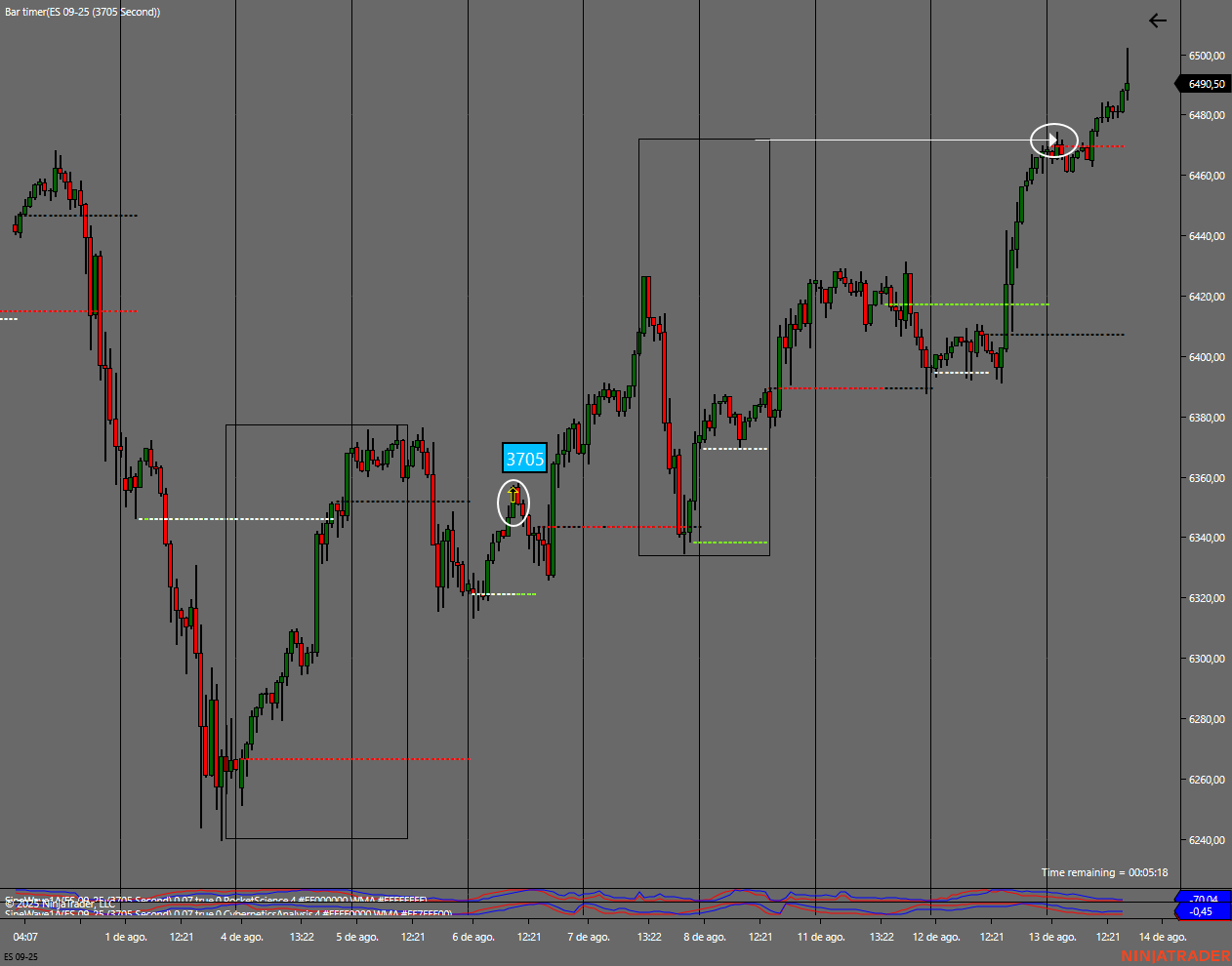 Ninjatrader y otras plataformas de graficación lo hacen en segundos y al no tener acceso a una graficación en al menos centésimas de segundo, no hay más remedio que abrir dos gráficos al redondeo por encima y por debajo, en este caso uno de 578 y otro de 579 segundos, etiquetadas como 1 y 2 en la captura.