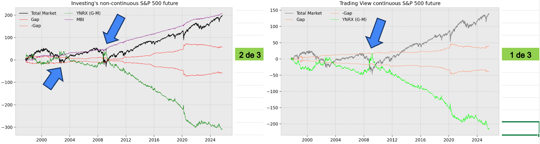 Ahora bien, ¿ese gaps es falso, o no lo es?, tiene explicaciones al porqué se generan ¿Porque si llevo empleando la muestra de investing más de 2 años, los futuros no continuos pueden detectar máximos y mínimos?, ¿Por que la base de datos de futuro continuo y no continuo del SYP500, no son capaces de detectar de igual manera los mínimos de las 3 grandes crisis que han azotado EEUU y al mundo desde el año 1992?