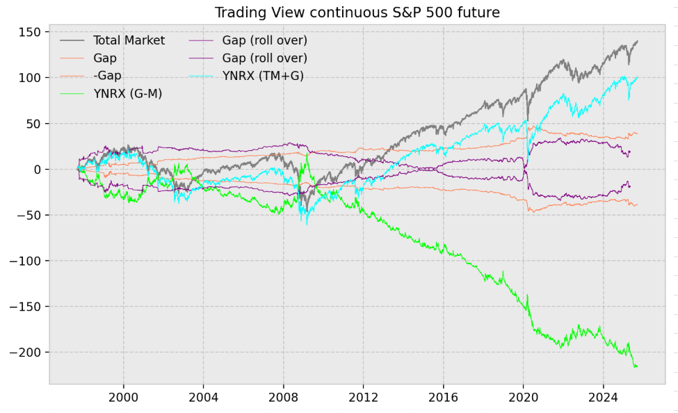 Si tomamos como ejemplo un índice como lo es el SYP500 y el DAX40, observamos como el futuro continuo y el spot, es igual en su componentes total market, pero ello no sucede con los componentes gap y market, y por tanto con los modelos que dependen de ellos.