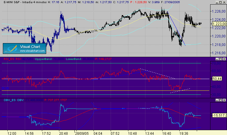 Las bollinger las uso de varias formas,en este caso en concreto para identificar las zonas de sobrecompra o sobreventa del indicador guia, al ser bandas dinamicas nos marcaran el rango medio del indicador en lecturas extremas : sobrecompra-sobreventa del periodo que metamos( nº de barras) para que marque esas zonas extremas del indicador guia, en las bollinger los parametros tienen que ser muy largos y con un minimo de 3 meses de historico en el grafico, os preguntarais por que ese historico minimo y la respuesta es muy logica; las bollinger marcan la desviacion del indicador guia de su lectura media, si metemos solamente un mes de historico, las bandas exteriores no tienen datos suficientes para marcar con buena fiabilidad las lecturas extremas del indicador guia, hace falta mas historico para que las bandas exteriores marquen con buena fiabilidad los extremos del rango, para que se entienda facilmente es como si tomamos una estadistica de un sistema, si ponemos un periodo muy corto de tiempo los resultados son poco fiables, aqui ocurre lo mismo, la construccion de las bollinger, al ser unas bandas dinamicas almacena los datos del historico que pongamos, con tres meses es suficiente para graficas de 10-15 minutos, para dimensiones de tiempo mayores hay que añadir mas historico proporcionalmente para que tenga datos suficientes.