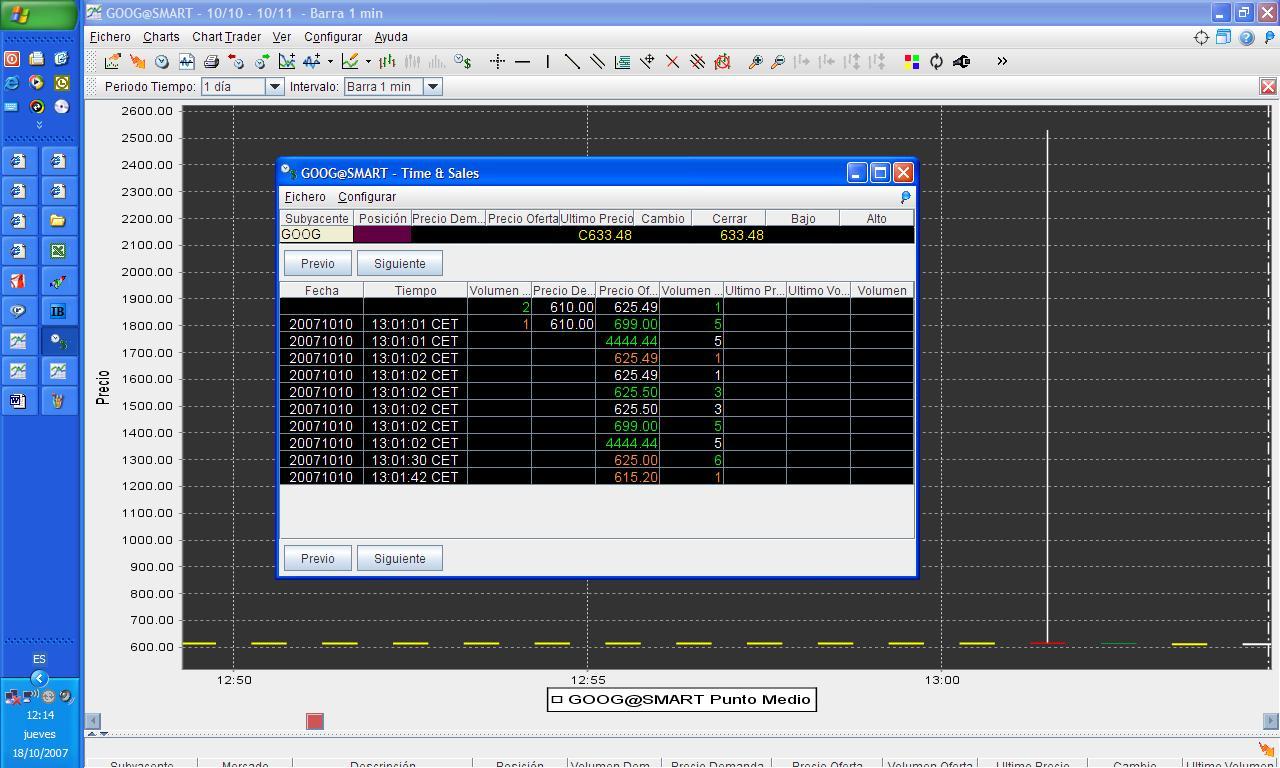 Este es el gráfico con su time & sales de un solo minuto del día 10-10-2007, a las 13:01 hora española. (gráfico 03). Como se puede observar, alguien ha hecho “algo” para que el precio se dispare durante un solo segundo.