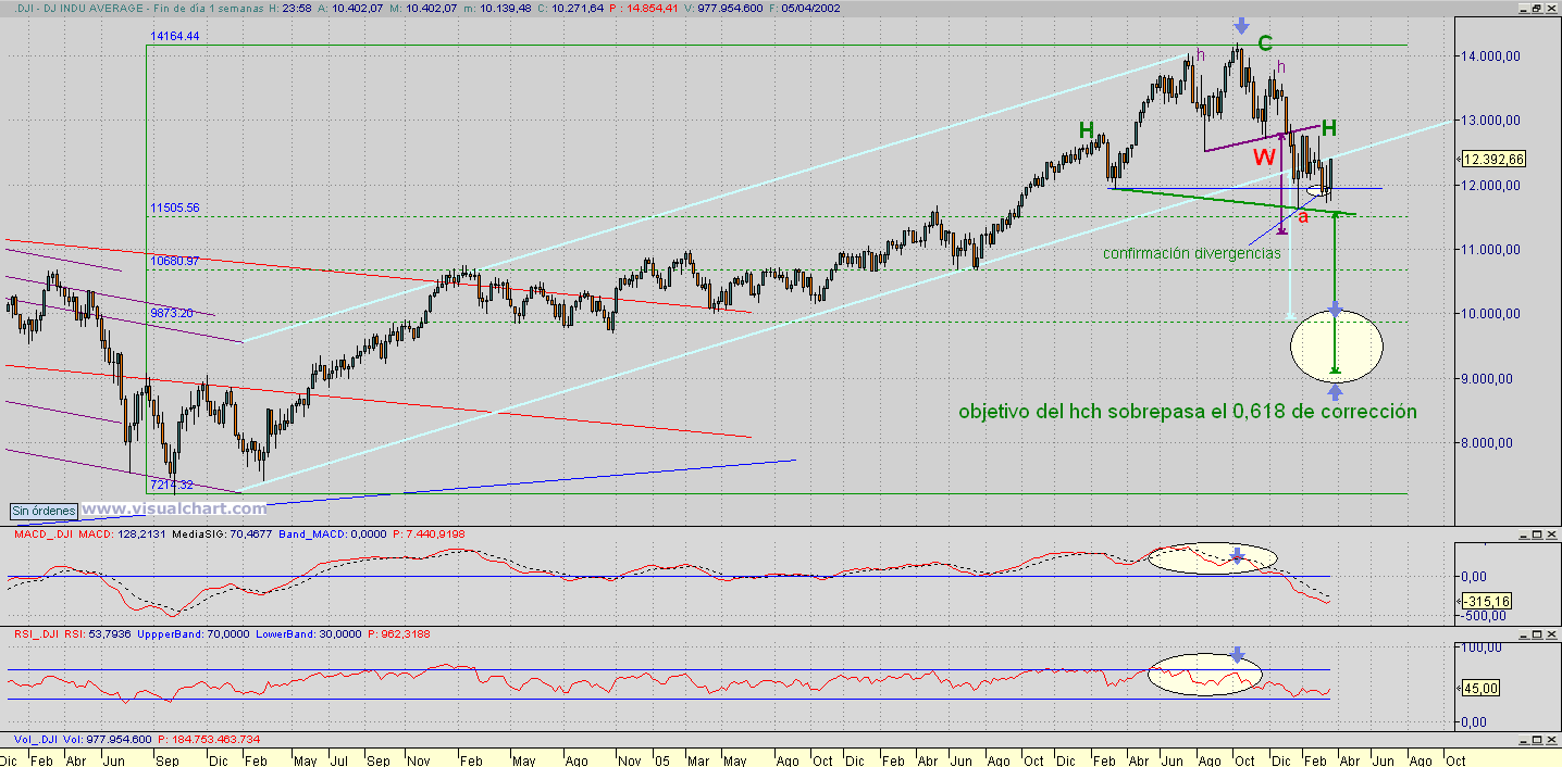 Lo que está claro es que lo único que hay realmente objetivo es el gráfico. Si quieres saber algo del mercado pregúntale al mercado, eh?, no?. Pues bien, el Dow anticipa objetivos de caída en cadena que le llevan a corregir más allá del 0,618 de la última onda alcista (la que empieza en 2003), lo cual a su vez anticipa que desgraciadamente no se quedará ahí la cosa porque está corrigiendo un impulso aún mayor. Es decir, la subida desde el 2003 no sería más que un Superciclo, la 5ª onda del Gran Superciclo que se está corrigiendo. Así, según esta cuenta, la onda 1 arrancaría en no sé donde de no sé que año (no tengo datos), la onda 3 del superciclo arranca en el año 1975, desde un Dow a 600 puntos, y la onda 5, esta última que hemos visto, en el 2003, desde un Dow a 7200 puntos (que es exáctamente el 0.618 de la 3ª onda lo que le da consistencia a la cuenta).