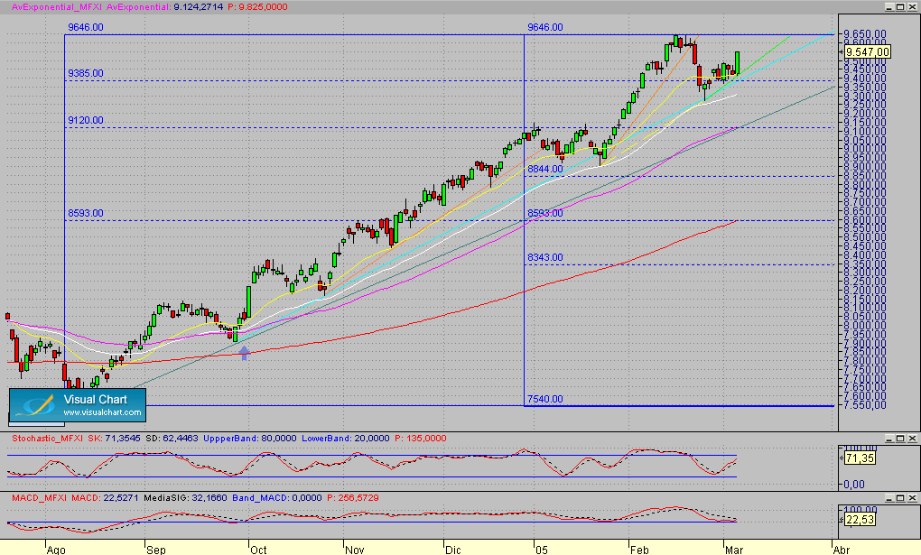 Hace un par de semanas comentábamos ke el referéndum sobre la constitución europea podía mantener los recortes en suspensión hasta el mismo y así fué, como habreis podido comprobar la correlación con el DJI era de 1.200 puntos de distancia y desde ya hace varios días es ahora de 1.400 ke era la correlación natural ke debía haber tenido.