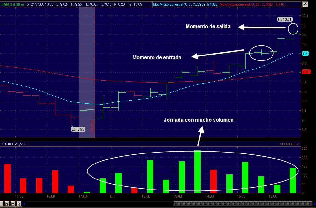 Mi mentor le llama el método del envión porque sobre esa hora una acción que ha superado los 6% con respecto al cierre del día anterior, es muy probable que siga hasta tocar el 10 % de rendimiento y lo supere.