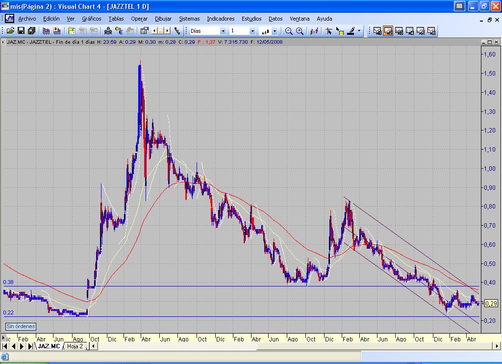 El stop en este valor si es lo complicado de poner pues 1 centimo es mas de un 3%, asi pues cada uno con su pulmon financiero. La rotura de 0.35 significaría que JAZZTEL muy probablemente inicie un nuevo tramo alcista para el medio largo plazo. Pero ruego máxima precaución máxime si el mercado se llega a desmoronar.