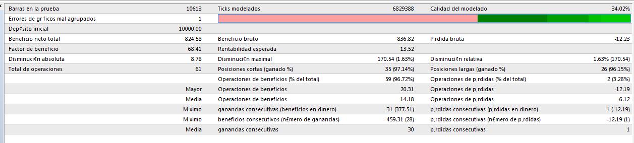 Un buen backtest ha de tener en cuenta diversos factores. Como regla general nunca te fies de curvas perfectas como las que cuelgas, a simple vista se ve que hay algo mal. La primera alarma esta en la calidad del modelado que la tienes en 34%, esta nunca deberá ser inferior al 90%. La calidad el modelado emplea la siguiente fórmula: