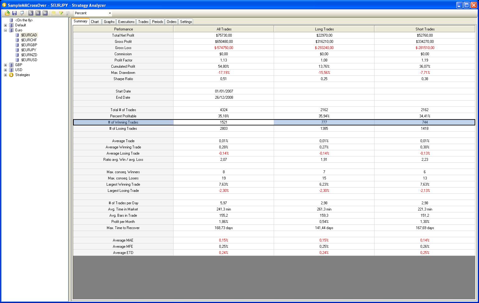 Podemos ver que el sistema está ganando 75.730 dólares que es la diferencia entre las operaciones ganadoras y las perdedoras.