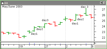 – Día 3: también es un inside day, siendo su máximo menor y su mínimo mayor que el de la vela del día 2.