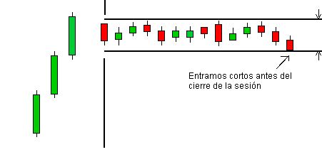 Una vez localizado el patrón, seguimos la sesión del día siguiente con un gráfico de 15 minutos. Si en los últimos 30 minutos de la sesión, el precio se encuentra cerca de los mínimos del día entraremos cortos, vendidos. La señal será especialmente significativa si el rango de esta sesión ha sido más estrecho que en sesiones precedentes.