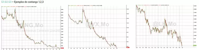 En los contratos de futuros si el precio del vencimiento más cercano es inferior al precio del más lejano se dice que el precio está en modo «contango», por otro lado si es superior se dice que está en modo «normal backwardation».