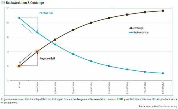 En los contratos de futuros si el precio del vencimiento más cercano es inferior al precio del más lejano se dice que el precio está en modo «contango», por otro lado si es superior se dice que está en modo «normal backwardation».