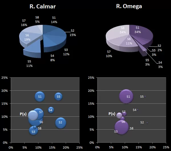 Con los ratios Calmar y Omega se obtienen rentabilidades muy similares (10,51% y 10,42%) para un nivel de riesgo similar. Sin embargo no se obtienen del mismo modo: La cartera Omega está mucho menos diversificada; la mayor parte del peso se concentra en tres activos mientras el resto tiene la ponderación mínima permitida (3%). En este escenario salta a la vista que para el gestor profesional resultará más atractiva la cartera Calmar que la Omega.