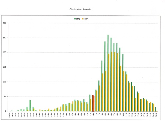 Analizando la distribución de rendimientos de una estrategia de reversión a la media (ver gráfico anterior), podemos ver que: