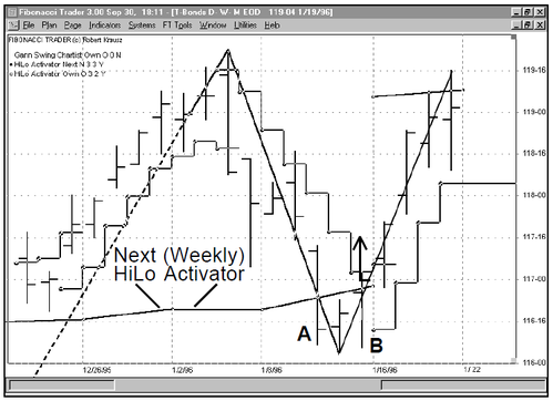 Las siguientes reglas nos permiten incorporar el HiLo Activator de una escala temporal superior en nuestro análisis. Es lo que Krausz denomina el Next HiLo Activator. Por ejemplo, si estamos trabajando el mercado en gráfico diario, nuestro Next HiLo Activator será el que calculemos en el gráfico semanal.