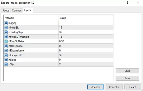 - nUseEscape: si lo ponemos en 1, activa un algoritmo especial para cerrar posiciones inmediatamente tan pronto como alcancen un beneficio mínimo. Podemos fijar tanto un nivel de salida con pérdida limitada (nEscapeLevel) como un nivel mínimo de take profit (controlado con nEscapeTP; este parámetro admite valores negativos para indicar pérdida máxima permitida).