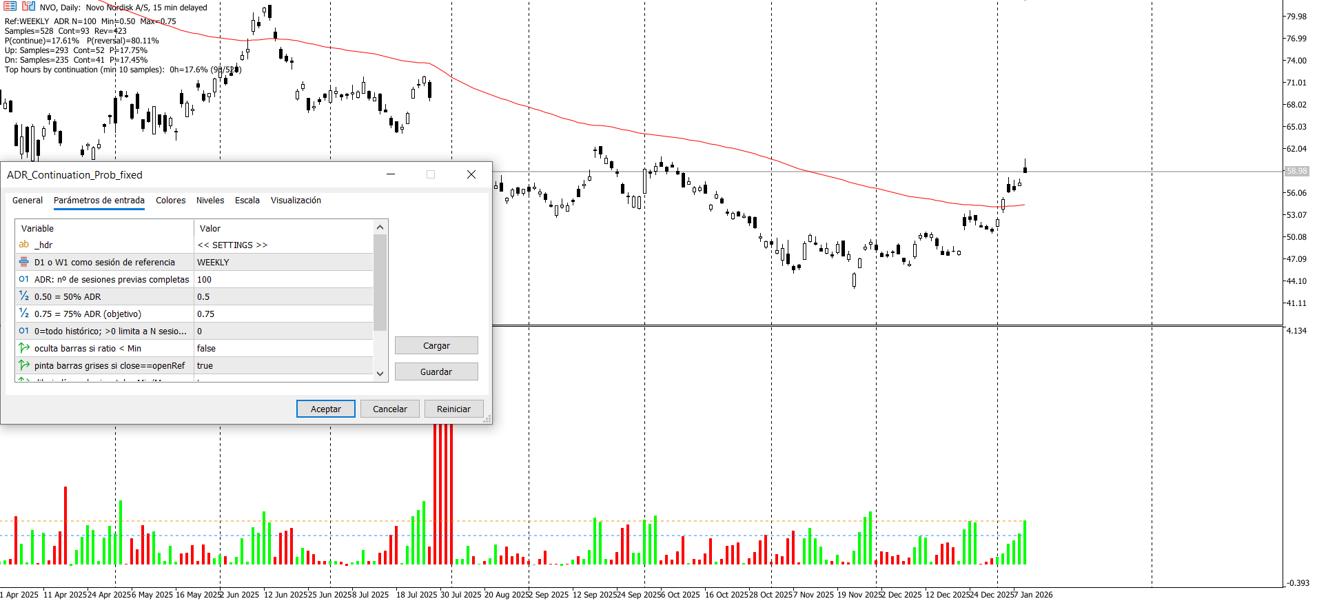 Os dejo por aquí este indicador por si alguien quiere entretenerse en estrujarlo más...yo por falta de tiempo y desconocimientos informáticos hasta aquí llego.. Básicamente te dice lo que el precio ya se ha movido X% de lo que normalmente se mueve; cuando llega a partir de X%, históricamente suele seguir hasta Y% o suele darse la vuelta, y además te dice en qué horas esa ‘continuación’ es más frecuente.
