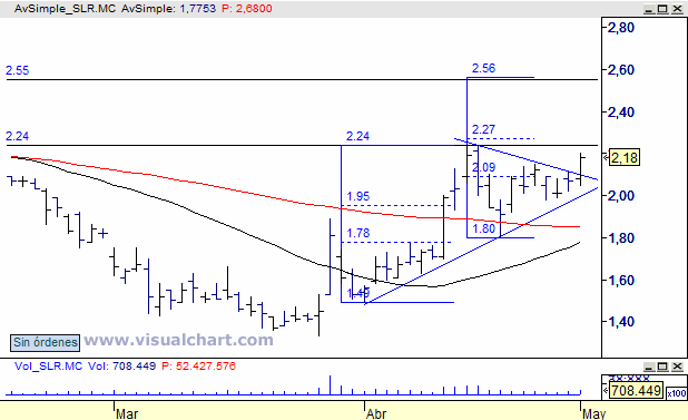 Ha iniciado un segundo impulso con objetivo en 3.10, pero si pierde la tendencia se convertirá otra vez en un primero, la media de 200 sesiones pasa cerca de la resistencia de los 2.55, esperaremos nuevos acontecimientos, si lo miraís en gráfico de 5 días se observa un lateral claro.-