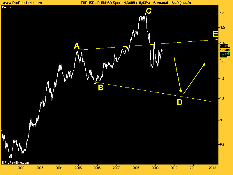 He estao repasando el largo plazo del euro, que no me encajaba con el panorama bajista de Neely de los mercados en general....y he encontrao una posibilidad que Neely no apunta, no sé por qué y que me parece más coherente que su visión