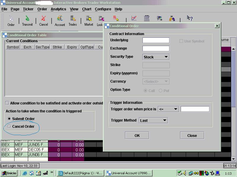 Recuerdo hace tiempo le pregunté sobre un error que me dio la TWS para cerrar la posición cuando llegara a una hora determinada (19:59:59) y me dijo que no era posible en futuros, que sólo funcionaba en acciones americanas.