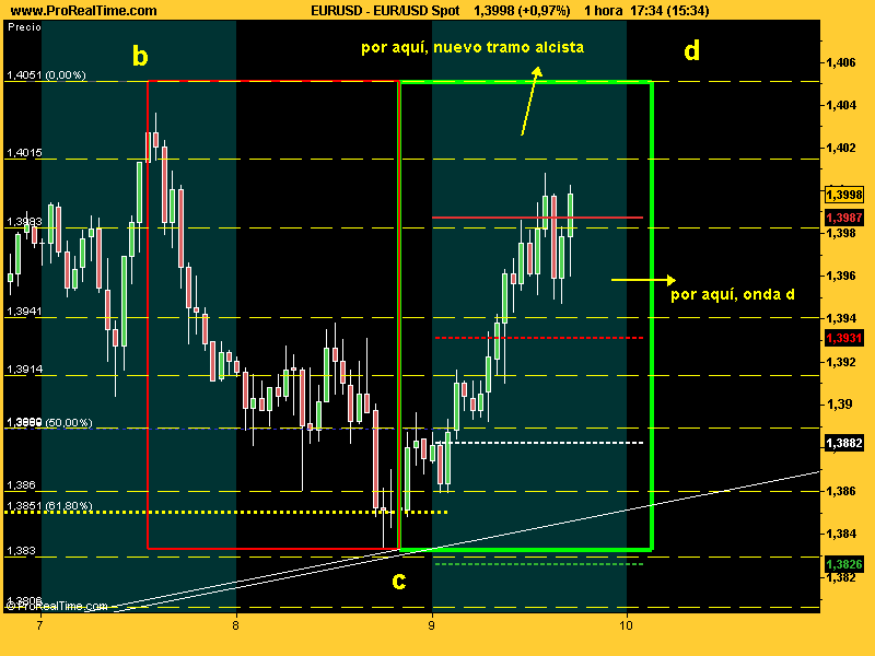 Xactamente ha hecho una onda A (o está haciendo y baja un poquito más, pero poco, vaya) y yo creo qu va a hacer un triángulo. Si es ese el caso no bajaría del mínimo de hoy, pero todavía es demasiado pronto para afirmarlo. Cuando se vea hasta dónde llega este próximo rebote, u sea, la onda b, pues ya podremos echar unas hipótesis jeje.