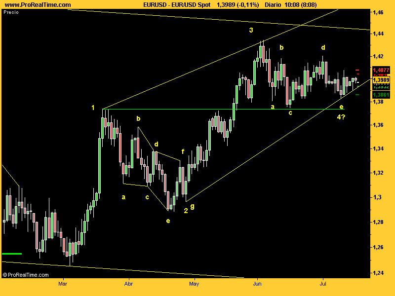 Pa mí el euro está lateral y aún le queda un último coletazo, pero vaya que tiene que hacer el tonto esta semana entera y parte de la otra, con lo que seguirá pacápallá pero no muy lejos y lo que un día bajo, lo subo al siguiente etc...o sea más de lo mismo jejeje...pa desquicio de los compradores de conos y disfrute de aquellos que pongan límites pa recoger beneficios y pasen de los stops jeje.