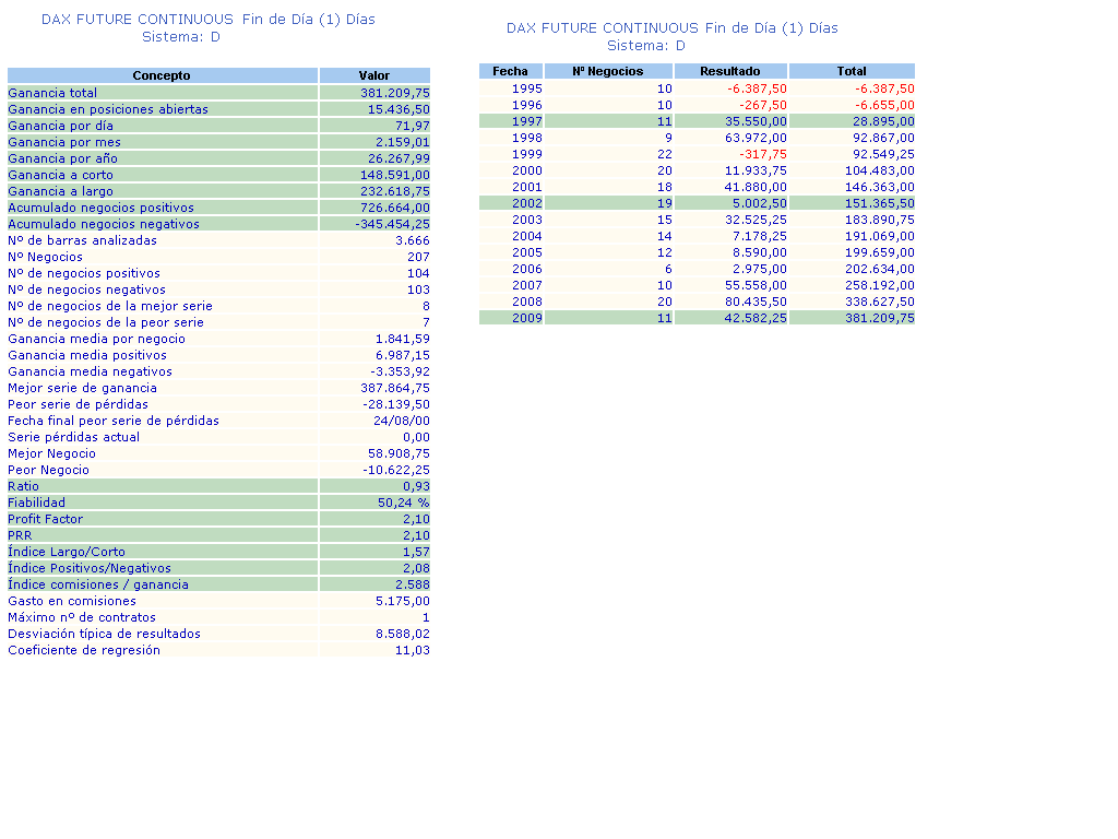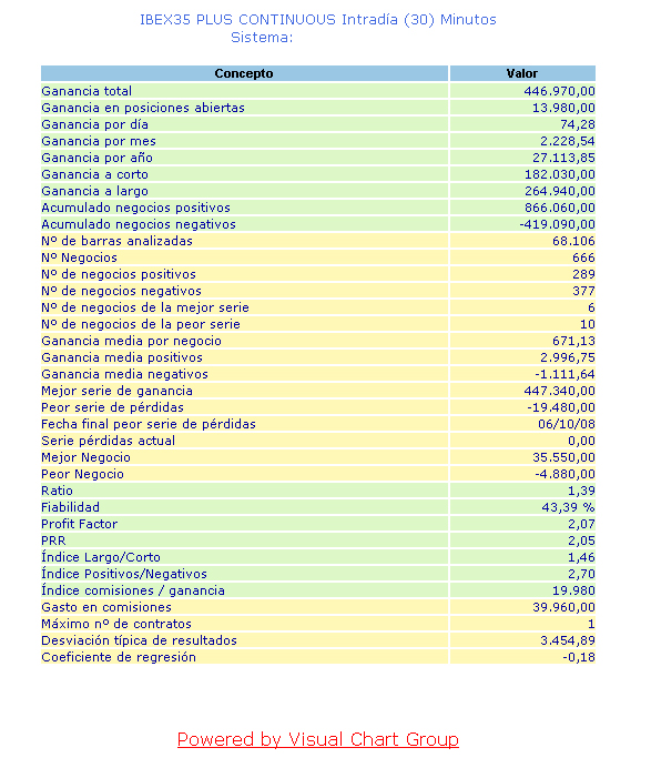 También hay que considerar al comparar sistemas el intervalo de tiempo en que funcionan, en estas estadísticas el sistema diario gana al de 30 minutos pero en beneficios gana el intradiario más de un46% que el diario, viendo las estadísiticas parece mejor el diario, lo que sucede es que los sistemas que funcionan en minutos tienen que hacer muchas operaciones para conseguir más ganancias y esto hace que las estadísticas bajen."Profit Factor : Este parametro nos indicara si hemos conseguido un sistema que da beneficios o no. Este parametro es calculado dividiendo el total de ganancias entre el total de perdidas. Si el PF es igual a 1 o menor, esto quiere decir que tu sistema no tiene beneficios. Un PF mayor de 1,5 no indica que tenemos un sistema que tiene unos beneficios suficientes para considerarlo. Un PF entre 1,5 y 2 nos dice que tenemos un sistema que supera a la media de sistema. Si tenemos un PF por encima de 3 estamos ante un sistema de trading excelente, aunque aún así deberemos mirar alguna otra variable para considerarlo excelente."