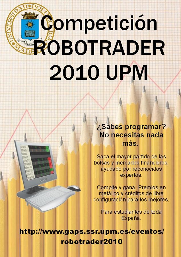 Se convoca la primera edición de la Competición ROBOTRADER 2010 UPM, para todos los alumnos de grado, máster y doctorado de España. La competición consiste en diseñar un algoritmo que opere en bolsa, comprando y vendiendo acciones, buscando el mayor beneficio. Una vez diseñados se pondrán a competir sobre el mercado real con 1.000.000$ en una cuenta simulada. Sólo hace falta saber algo de Java (o C++), tener una buena idea y algo de suerte (o que los demás participantes no la tengan).