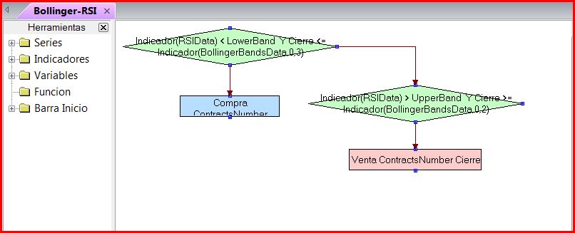 En el ejemplo de la imagen se puede ver como se utilza el RSI y las bandas de Bollinger para determinar una orden de compra o de venta. :smt006