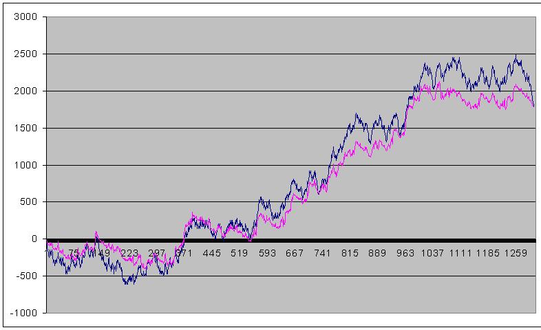 La curva azul es la normalizada del eurus. La rosa es la del resultado acumulado con estrategia del Labou de SUBE 50= GANO 50. Como podeis ver……, a menos que me haya salido mal el excel del labouchere….. (que todavia no he pillado el fallo), cuando sube gano y cuando baja pierdo…., aunque haya acumulacion de resultados.