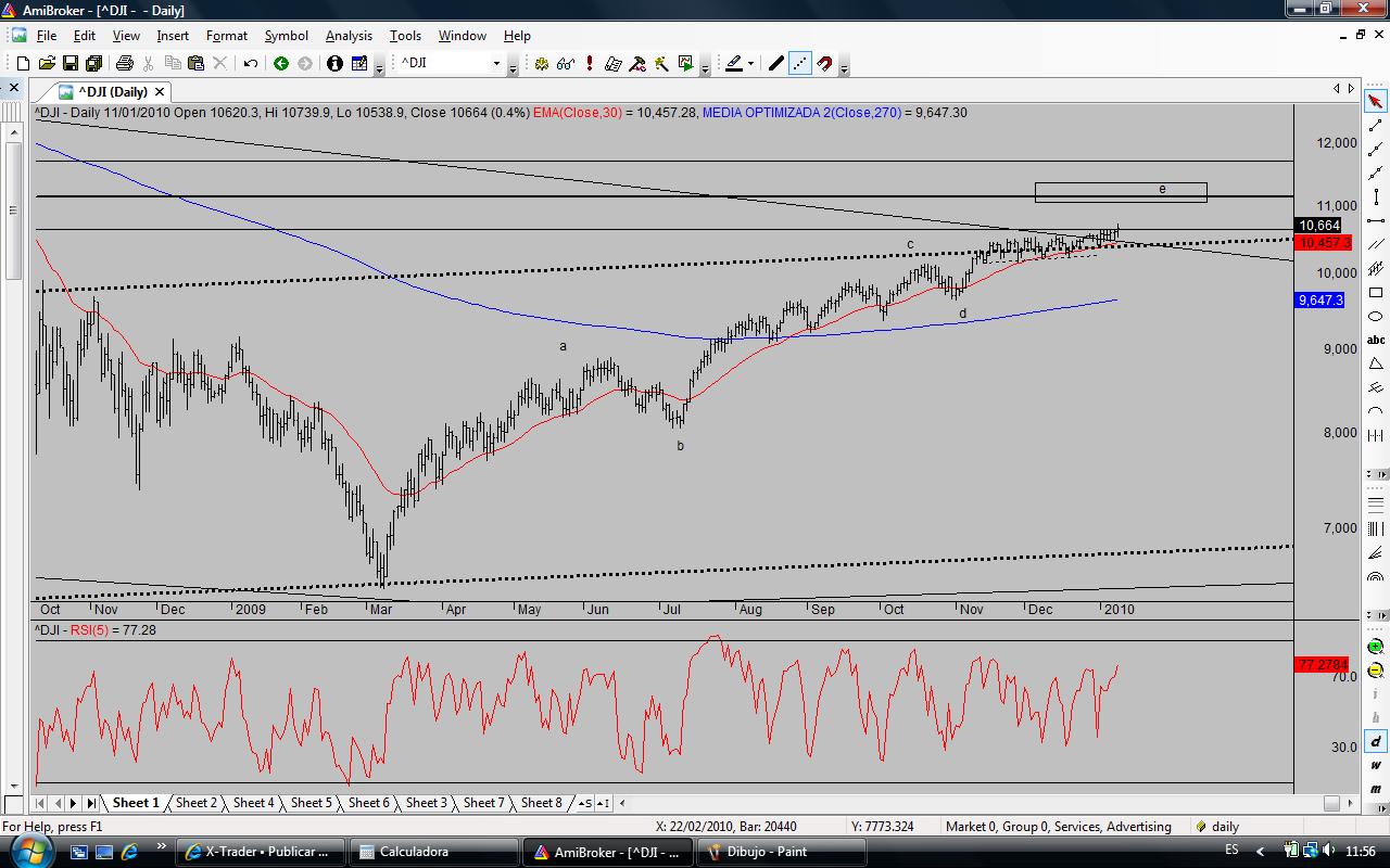 Hola, creo que estamos ante el último impulso que falta para llegar a una zona de techo a medio por lo menos. El recuento que pongo abajo casa bastante con los movimientos tanto por su fuerza como por su velocidad..una pauta correctiva a-b-c-d-e en cuña y que podría llevar al Dow sobre los 11150 aprox. y después ya veremos por donde sale.