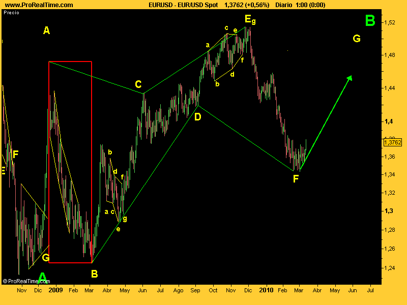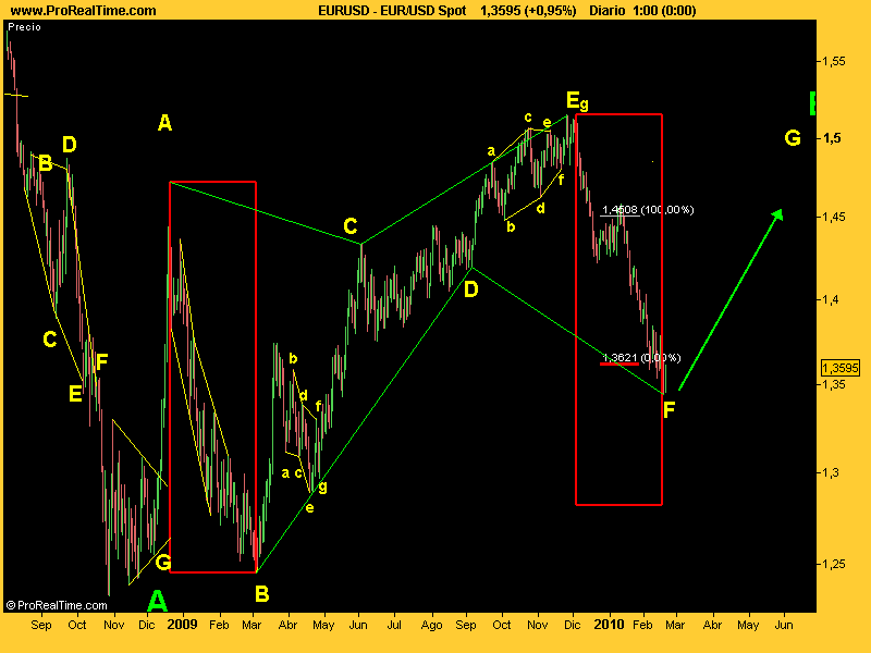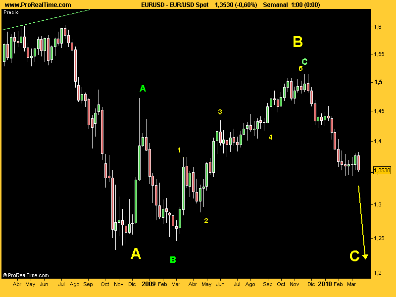 Po zí, que era de un grado menor el rebote...y ahora lo que queda es que la bajada es del mismo grado que el arreón desde máximos...ahora bien, creo que desde el inicio de la crisis estaríamos en un triángulo contracto, perdiendo volatilidad y no será tan fuerte esta C como lo fue A, digo yo (B amarilla retrocede más del 61 de A amarilla)...pero cortos un par de semanas, oiga, polomeno...que la onda contratendencia ha sido ridícula, poca fuerza alcista.