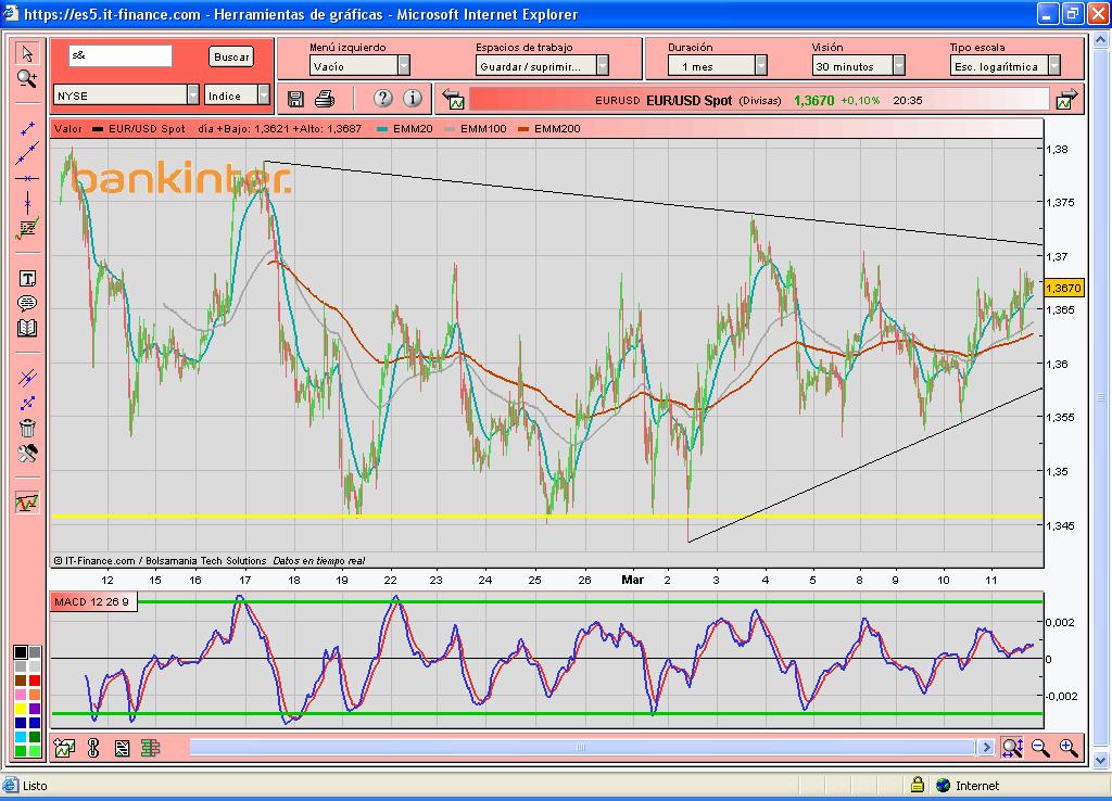 Pero la zona de control del 1.3690 ha parado el precio y han estado consolidando por encima de la parte alta del triángulo toda la tarde.