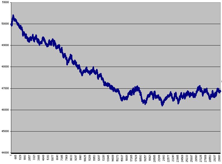 Hombre yo lo decia porque la aleatoriedad a la larga va formando el 50% igual de 100 veces que tiras una moneda al aire no te salen 50 veces cara, pero cuando hayas tirado 5000 veces la moneda el porcentaje se acercara mucho mas a 50%.Rafa7 escribió:Gracias kefren.kefren escribió: Creo que se podrian hacer calculos para que por ejemplo cada X puntos hacia abajo tienes X posibilidades de que si entras en ese punto al alza pues, al ser el movimiento aleatorio, es decir moneda al aire 50% de probabilidad de que suba a que baje, si ha bajado 10 puntos pues la probabilidad de rebote sera mayor, que no tiene porque ser cierta, pero jugando con la probabilidad creo que se podria sacar algo en claro y hasta crear un indicador en base de esto.
