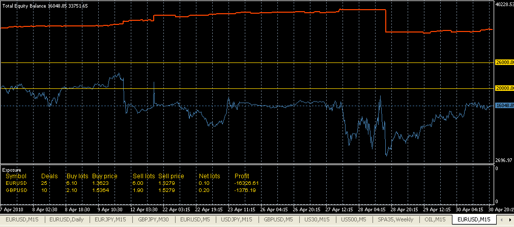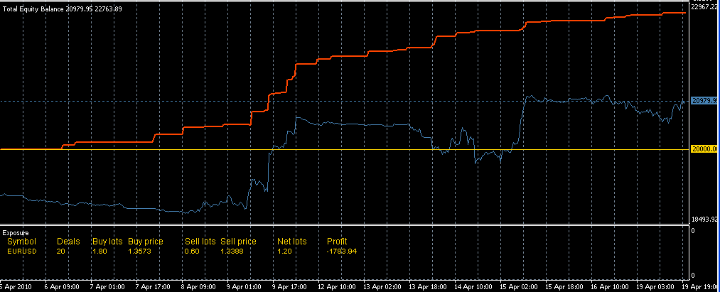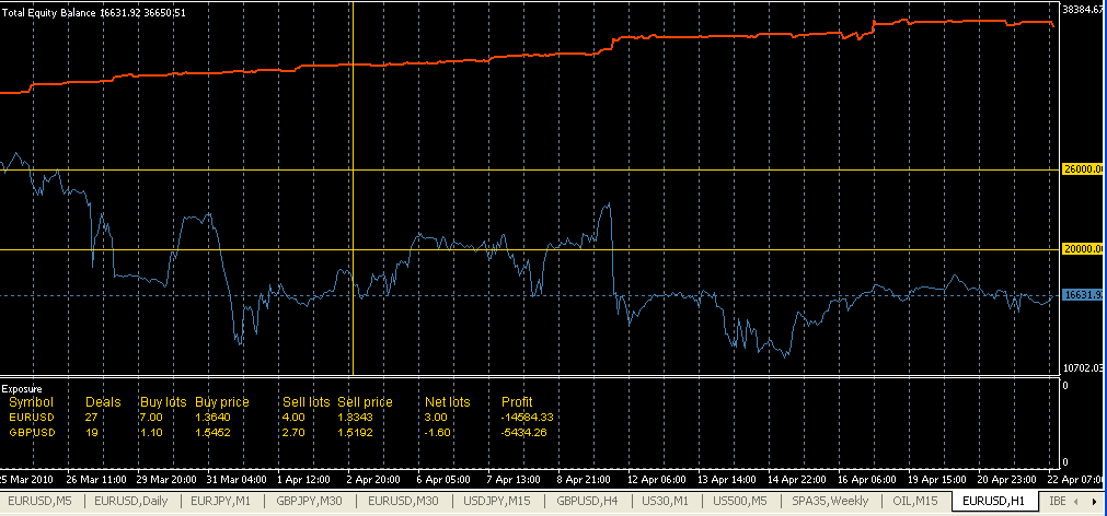 Este es lo más aburrido que te puedes encontrar. Ya pillará la tendencia buena, mientras con que se pague los gastos de estancia full-time (24X7X365) tengo más que suficiente, ya romperá el eur/usd algún día si le da la gana y es entonces cuando tiene que ganar por las semanas y/o meses anteriores. Se debe procurar mantener el hedge sin grandes desequilibrios y aprovechar los cierres de ajustes para compensar costes de swaps, rollovers, etc.