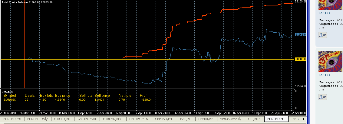 Intentaré ayudar lo que pueda, pero sólo hablo ya de aspectos generales del hedging, no concreto parámetros ni técnicas elaboradas ya que la finalidad que tenía esta prueba ya la he cumplido de largo. He conseguido parametrizar un sistema hedging gracias a las colaboraciones de otros foreros que se han interesado por este sistema.