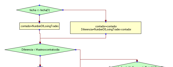 Tengo varias estrategias diseñadas y funcionando en tiempo real, pero en una de ellas me encuentro con el problema siguiente: en la fase de estadistica y testeo del sistema, sucede y funciona todo según lo previsto en el mismo, pero al conectarlo al mercado real, no funciona igual. La idea es que el sistema tiene un límite diario de operaciones negativas. Máximo 3. Para ello utilizo una variable que llamo "contador", la función NumberOfLosingTrades, una variable que llamo "diferencia" y una variable "Maximoscontratosdia" de valor fijo 3 (optimizable). Tal como esta programado, si el sistema lleva 3 operaciones negativas en el mismo día, si esta conectado en mercado real, el sistema da orden de entrada de una nueva operación, iniciándose una 4ª operación. Si reinicio el sistema, esta 4ª operación iniciada desaparece. Por lo tanto tengo claro que hay un error en la programación que no acabo de encontrar. Les adjunto el pantallazo del inicio de la programación del sistema para que puedan indicarme donde me estoy equivocando. Tras esas condiciones iniciales que indico en el adjunto, ya vienen las condiciones de entrada en mercado, que no tienen ningún problema.