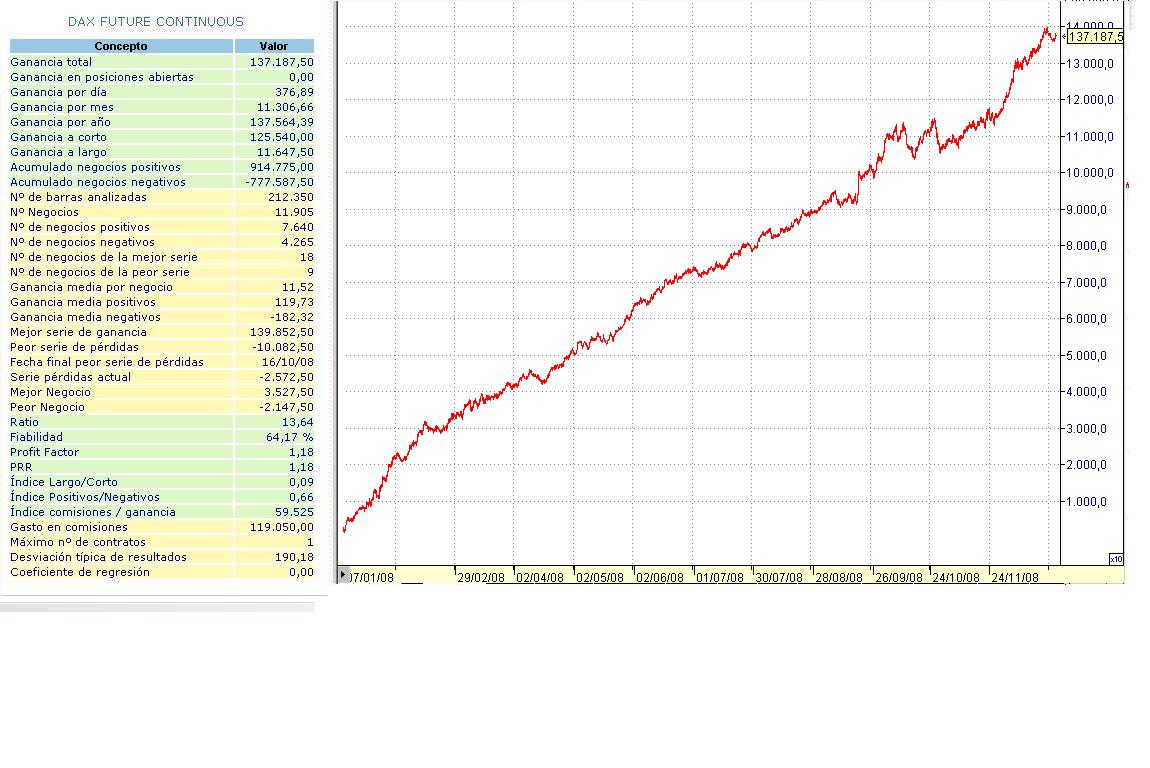 bolsa1 escribió:Bueno INtrader... mi Campana sigue perfectamente vigente y viento en popa. De hecho, en las últimas pruebas que hice para implementar un par de cosas (del verano pasado, creo recordar) hubiera ganado un 47% con un 7% de DD en tres meses. ¿Cuál es el problema entonces? Pues que soy muy concienzudo, y le hago muchas perrerías a mis sistemas... y para ejecutar la campana en condiciones necesito hacerlo en 5-7 mercados, y con tres contratos por mercado al menos, y siguiendo mis cálculos de capital mínimo para empezar con la operativa, necesito entre 35.000 y 40.000 dólares (no recuerdo la cifra exacta), cosa que no dispongo (acabo de comprarme un piso, y la entrada la pagó la campana, por cierto).